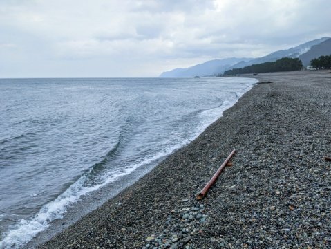 さっそくヒスイ探し開始!足元を見ながらゆっくりと進んでいきます。貝殻などはほとんどなく、ひたすら石ころばかりが積み重なる海岸。