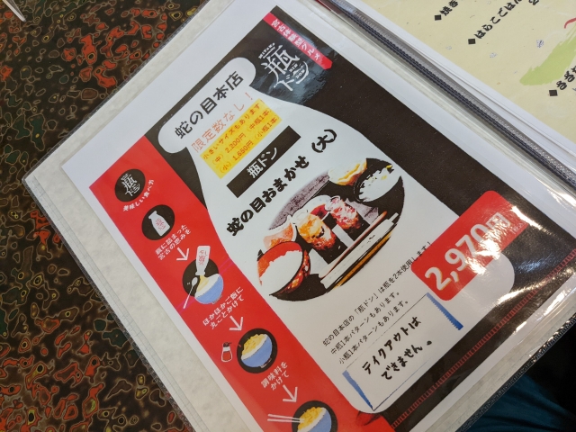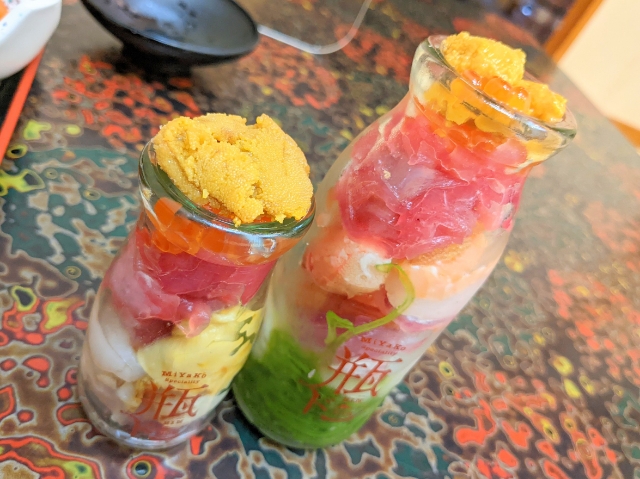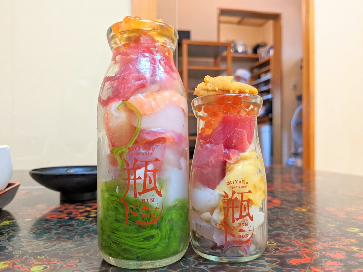 瓶に入った食材がインパクト抜群な宮古名物「瓶ドン」。味はもちろん、カラフルな姿で見た目にも楽しいご当地グルメです。今回訪問した蛇の目というお店では、そんな瓶が2本という多幸感あふれるメニューを扱っています。
