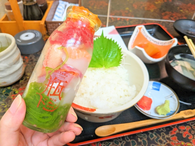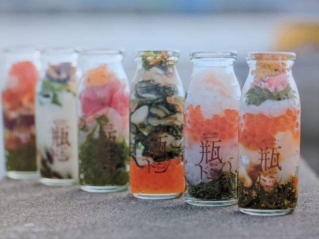 そんな独特のスタイルからヒントを得て、考案されたご当地グルメが「瓶ドン」。牛乳ビンの中に様々な海産物が詰まっており、それをお好みでご飯にのせて食べるというオリジナリティあふれるメニュー。
