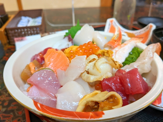 ウニ、イクラ、マグロ、カニも出てきました!蛇の目の瓶ドンは、基本的に具材おまかせ。何が出てくるかわからないところも楽しみです。
