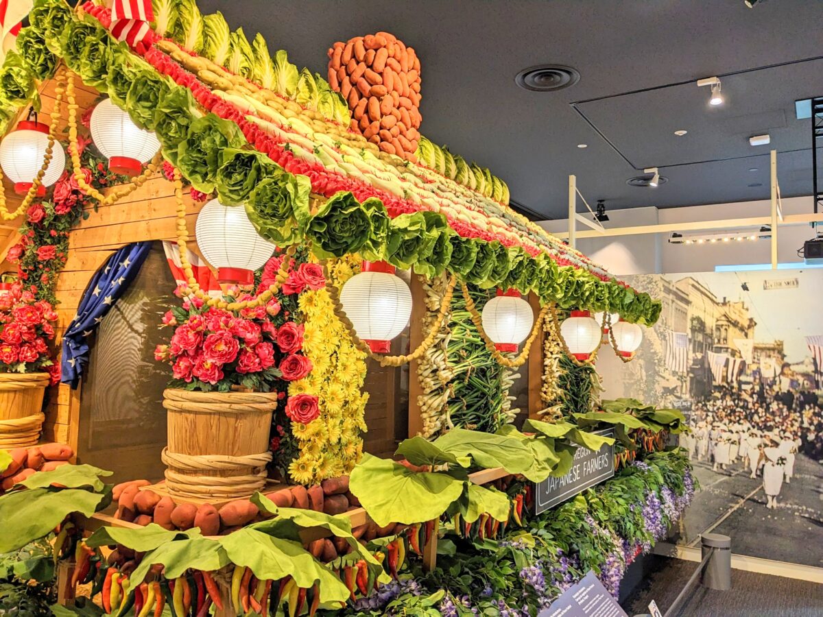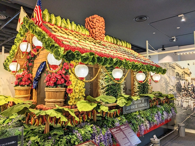 来館者を出迎えるのは、カラフルな小屋のようなもの。こちらはアメリカのオレゴン州ポートランドにて開催されるローズフェスティバルにおいて、日本人農家が作った山車(フロート)。イチゴ、ハクサイ、ジャガイモなど様々な農作物がびっしりと並べられており、見ているだけで明るい気持ちになります。