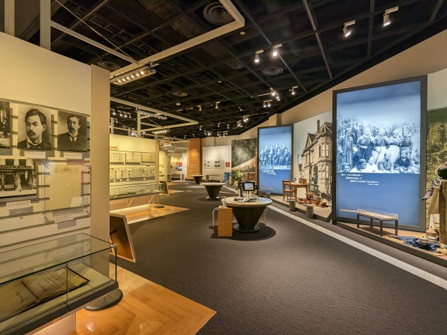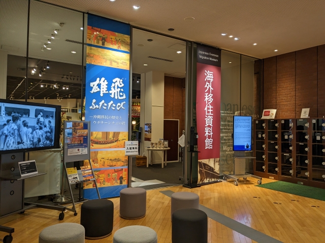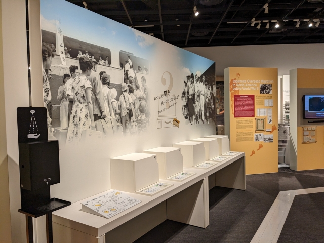 海外移住の歴史がパネルや資料で紹介されている館内。日本の開国から20世紀初頭の海外出稼ぎのブーム、排日移民法と呼ばれるアメリカの移民法、さらには戦時中に強制収容された移民についても幅広く展示されています。