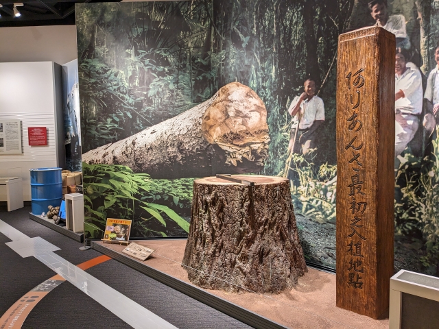 巨大な切り株が置かれたブラジルのアリアンサ移住地。ここでは森林を切り開いて移住地を作り上げていったそうです。切り株の上にはオノが置かれており、かまえて記念撮影することもできます。