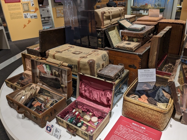 面白かったのが、海外へ移住した人が日本から持っていったもの。トランクや柳行李には、裁縫道具や衣類、香水や化粧道具なども見ることができます。