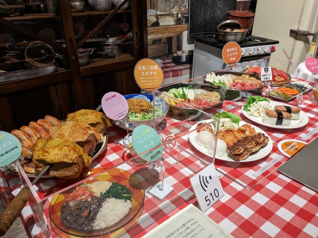 移住者の食卓には様々なメニューがずらり。ピーマンやセロリが入ったスキヤキ、スパムのおにぎりなど、海外の要素が入った日本料理がとってもユニーク。