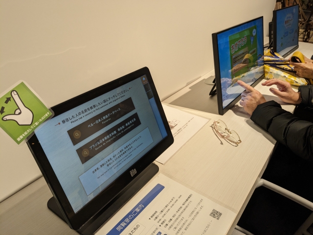 タッチパネルで遊べる移民学習コーナーには、移民の歴史クイズ、移民カルタのコンテンツが入っています。クイズでは館内の展示に関する出題も多く、じっくり見た人は簡単に答えられる場合も・・・・!