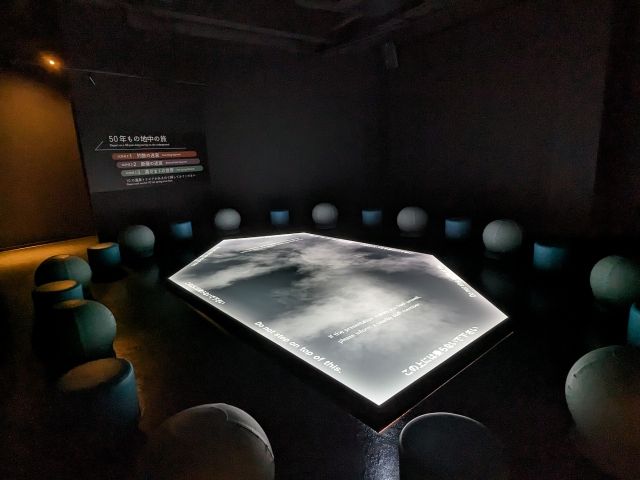 まずは映像コンテンツからスタート。床面に広がるスクリーンとそれを取り囲む椅子があり、自由な角度から映像を楽しむことができます。