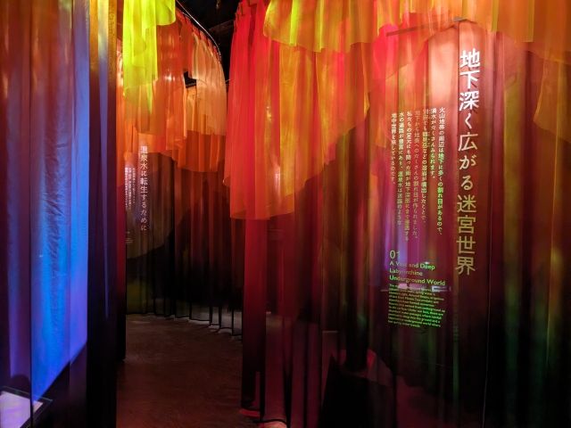 次のエリアは灼熱の迷宮。火山地帯の地下を通り抜けながら別府温泉誕生のヒストリーなどを学んでいきます。天空から降り注いだ雨粒が迷路のような地下を越える、そんなシーンを再現しているのです。なお、本当に迷路のように作られているので、注意しないと道に迷います。