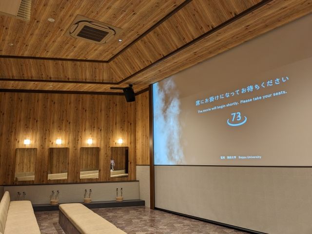 そんなわけですっかり温泉の気持ちになったあとは2階へ。続くシアタールームは、木張り風の壁、まわりには蛇口・鏡・桶があり、まるで洗い場のような雰囲気。
