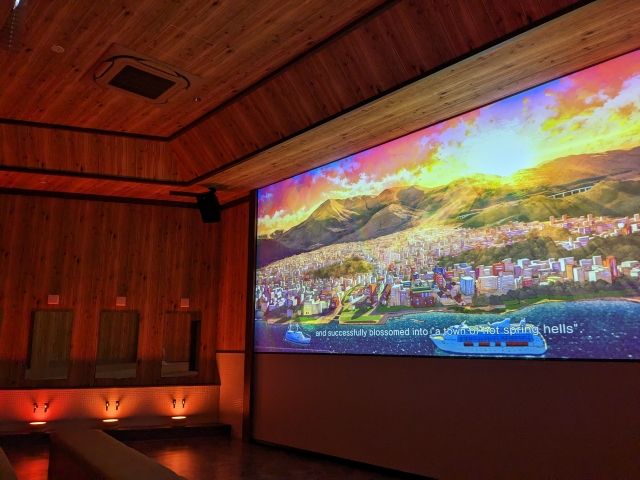スクリーンに流れるのは別府の歴史。一遍による開湯伝説から観光地として発展する様子が映し出されます。