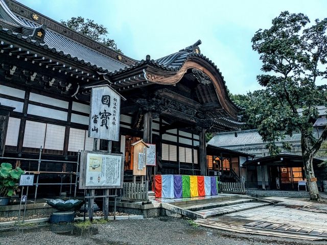 山門の先にすぐ見えてくるのが本堂。大正8年(1919年)に完成したもので、入母屋造りの棧瓦葺き仕立て。