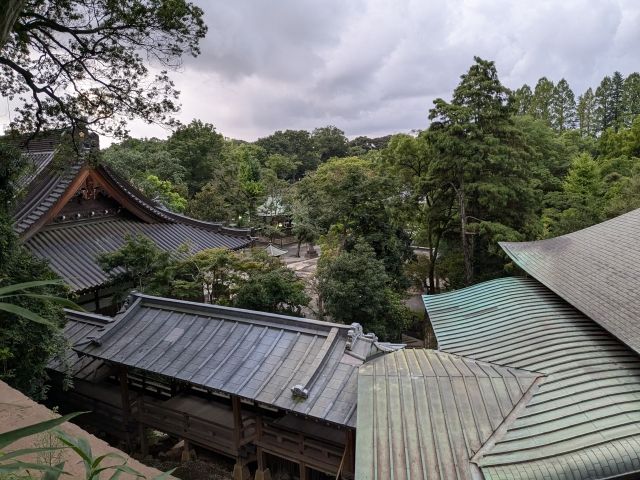 高い位置にあるため、ここからは他の堂宇も見渡せます。左が本堂、右が元三大師堂。大正時代に建立された本堂に比べて、江戸時代の建築である大師堂は屋根にその歴史が詰まっているように感じます。(といいつつ、葺き替え作業が行われていたら完全な思い込みです)