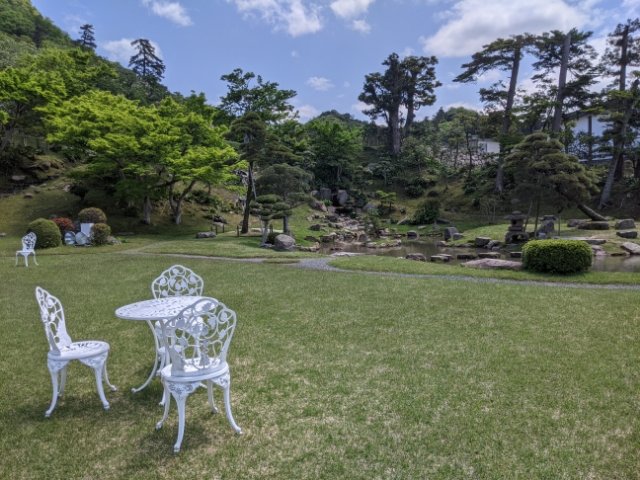 館の裏手には宝隆院庭園が広がっております。鳥取城跡がのこる久松山(きゅうしょうざん)を借景にした池泉回遊式庭園。建物と同じく真っ白なテーブルが置かれており、自由に過ごすことができます。