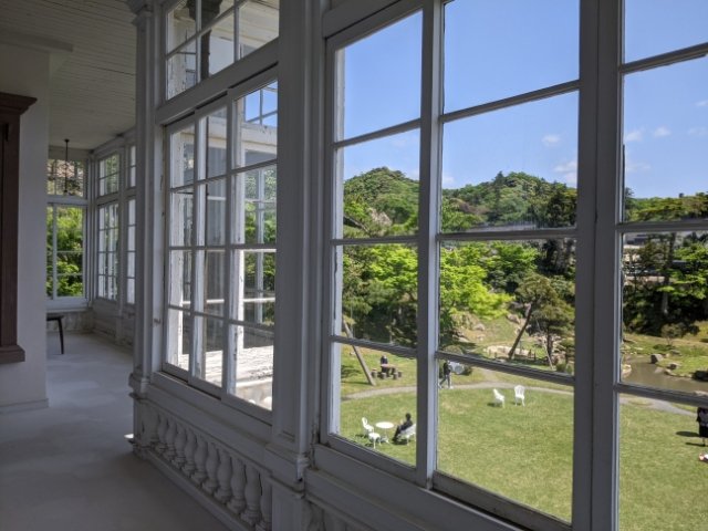 2階のサンルームからは、さきほどの宝隆院庭園が見渡せます。あざやかな芝生では、写真を撮ったり休んだりしている人の姿も。