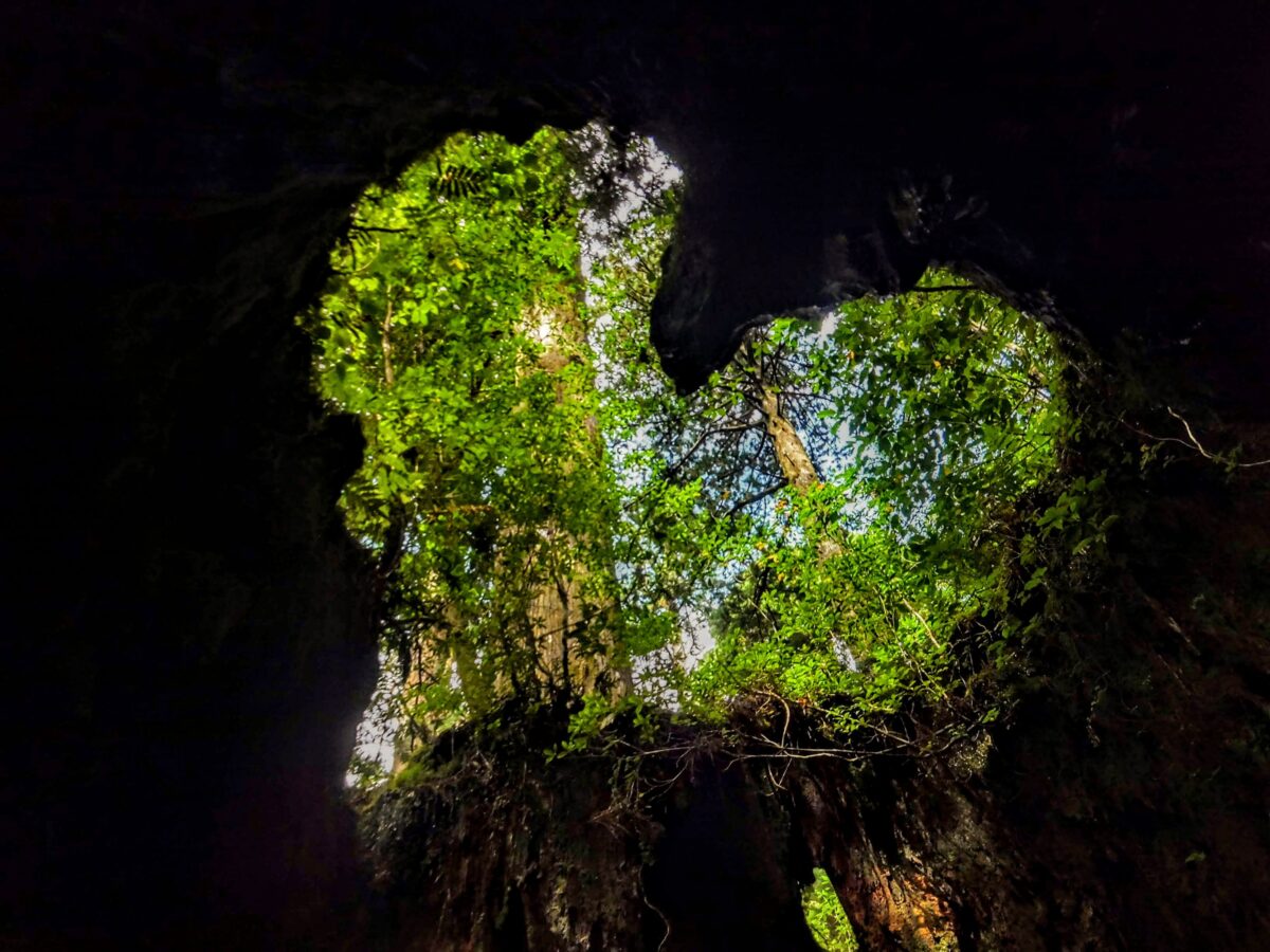 有名な屋久杉がそろった縄文杉コースですが、縄文杉に次いで有名なのがウィルソン株。外から見ると先ほどの翁杉と同じ切り株に見えますが、このウィルソン株は人が中に入ることができます。中に入って上を見上げると、木々がざわめく空が広がります!