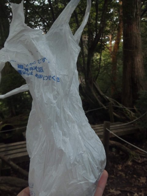 険しい山道も終わり、大株歩道入口に到着。ここで30分ほど休憩していきます。バックパックから縄文杉ビニール袋が出てきました!似てませんか・・・?