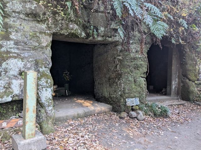 墓地を抜けて進んでいくと、岩肌に掘られた穴「やぐら」が見えてきます。