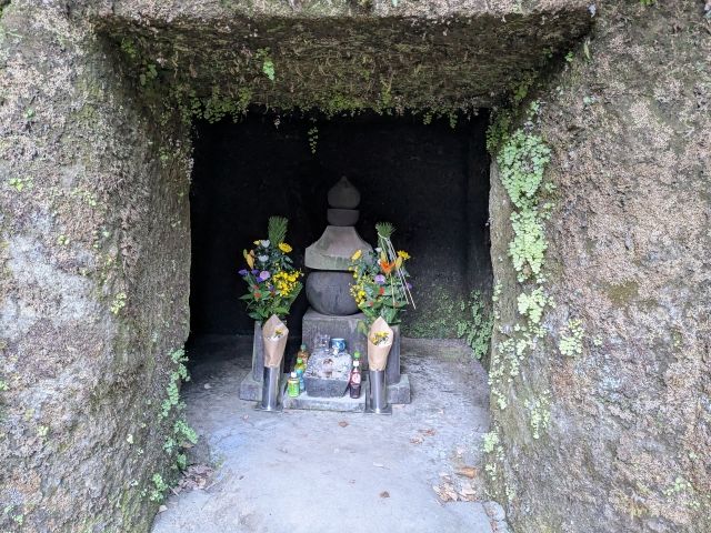 そんなやぐらの中でも注目はこちら、北条政子のお墓。源頼朝の妻であり、頼朝の没後は尼将軍として鎌倉幕府を支えた人物です。内部には五輪塔が建てられており、花やお供え物が見えます。
