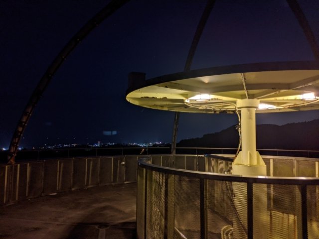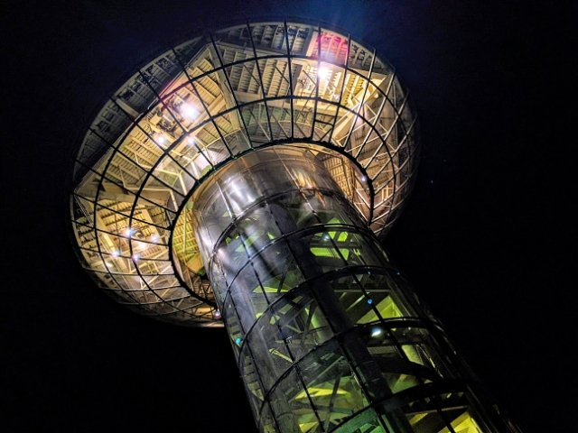 輝く螺旋階段を登って、再びてっぺんへ。市の中心部からは離れているため、夜景はほとんど見えません。そのかわり真っ暗な自然が広がっており、心地よい孤独感。
