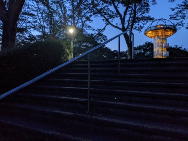 この展望台、日が沈むとライトアップが行われます。真っ暗の公園で輝きを放つ展望台は、誰かを待っているかのようです。