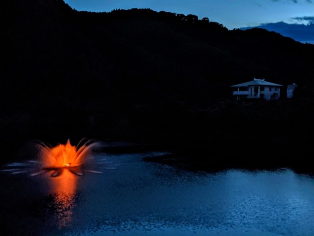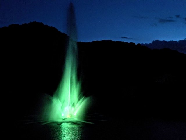 真っ暗なダム湖に吹き上がる噴水は神秘的。あたりはとっても静かで、水の音だけが響き渡ります。