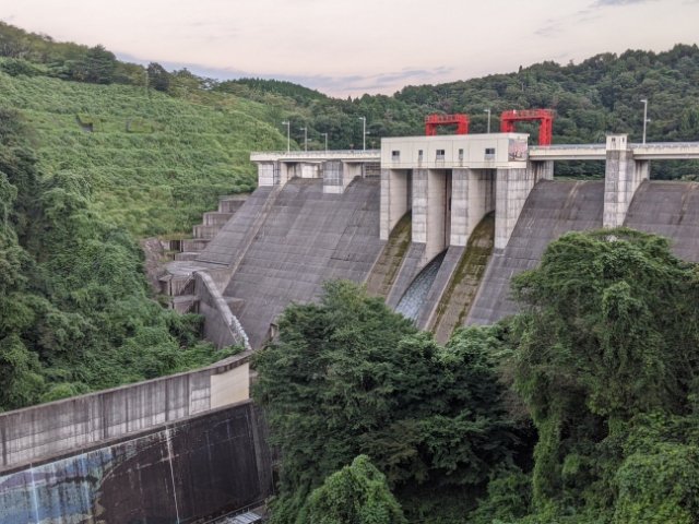 十王パノラマ公園に来たら、ぜひ立ち寄りたいのが十王ダム。公園のすぐ麓にある重力式コンクリートダムで、車ならばわずか1分ほどでアクセスできます。