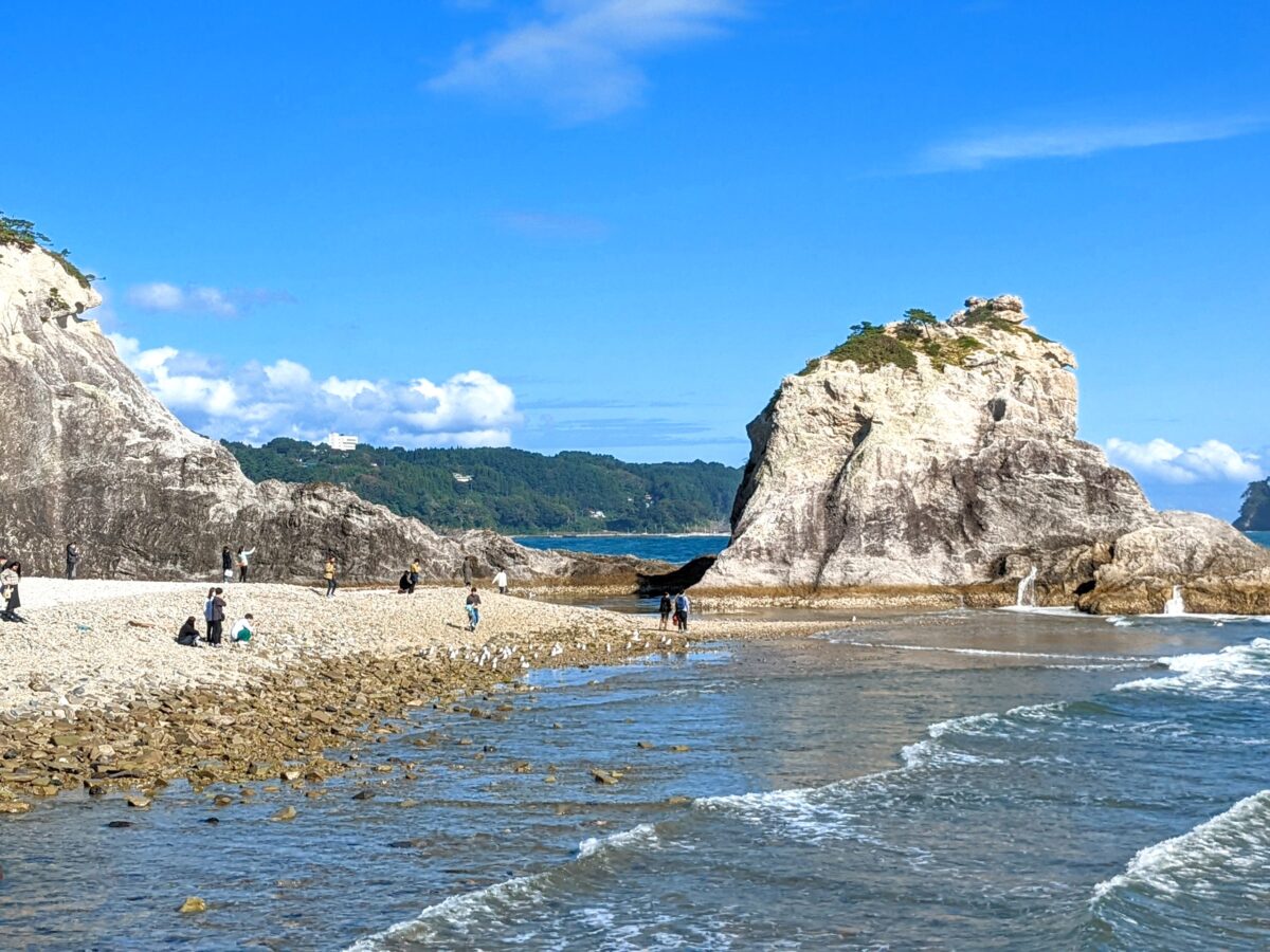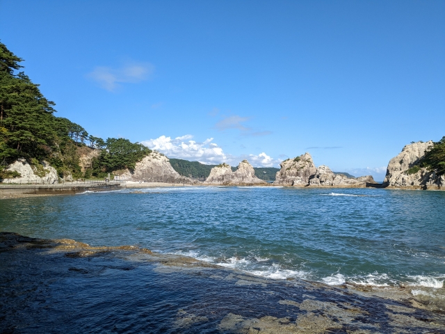 岩手県の宮古市にある浄土ヶ浜は、青い海にとがった岩が浮かぶ人気の景勝地。宮城県、岩手県、青森県の太平洋側に広がる三陸復興国立公園に属しています。
