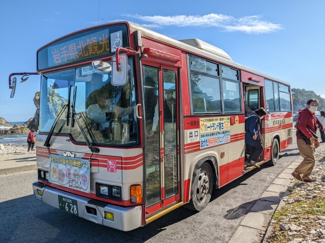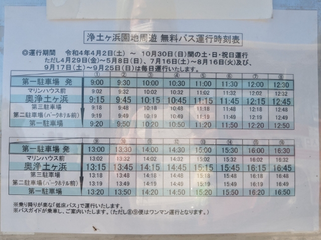 浄土ヶ浜では、4月1日~10月31日のマイカー規制期間の土日祝日に限り、浄土ヶ浜エリアを周遊する無料のバスが運行しているのです。めぐる順番は、第一駐車場・浄土ヶ浜マリンハウスから、奥浄土ヶ浜、第三駐車場、第二駐車場とまわり、最後にまた第一駐車場に帰ってきます。