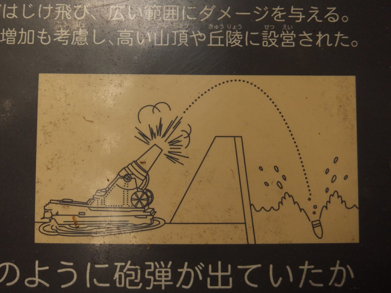 当時の砲台は放物線を描いて飛ぶため、このように壁に囲まれていても大丈夫だったようです。これで狙いを定めるのは相当な腕前が必要だったのではないでしょうか。