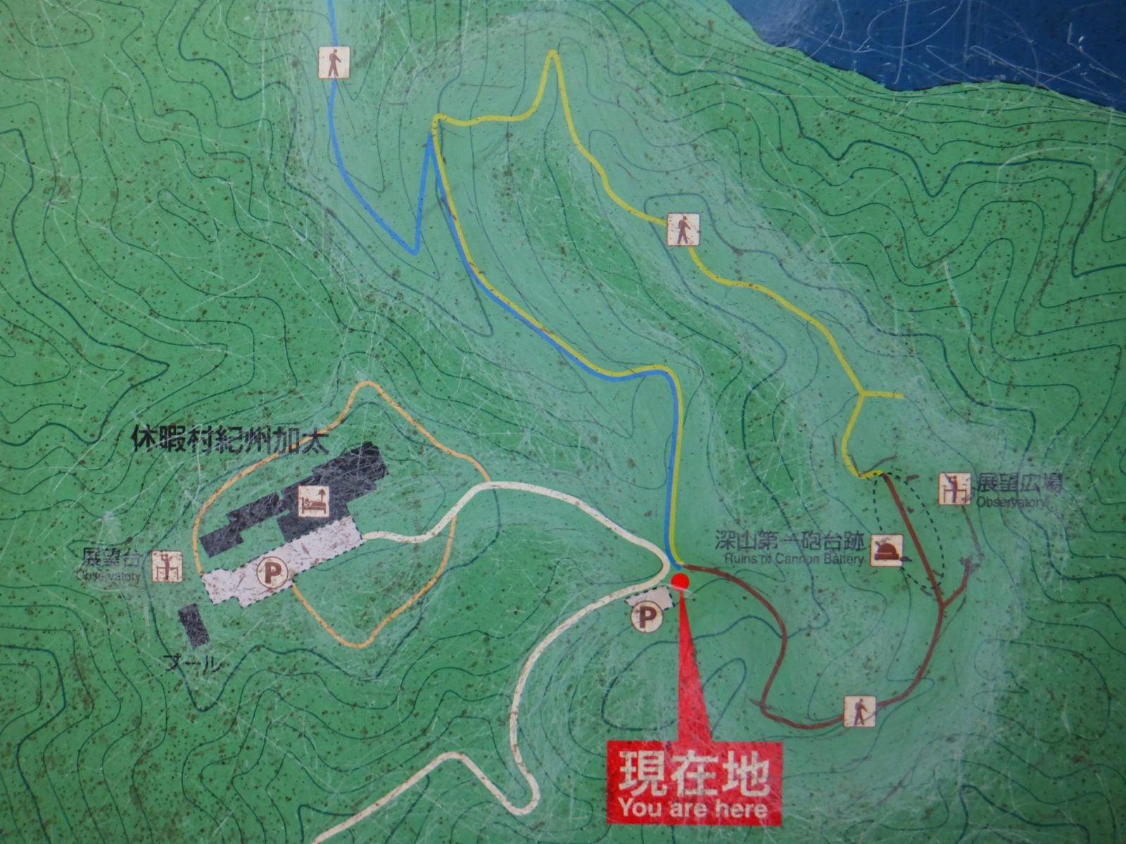 深山砲台跡は休暇村紀州加太から伸びる遊歩道にあります。車で行く方は、カーナビを休暇村にセットすると良いかと思います。車が無い方は、加太駅から出る休暇村の無料送迎バスが1時間に1〜2本出ているそうです。