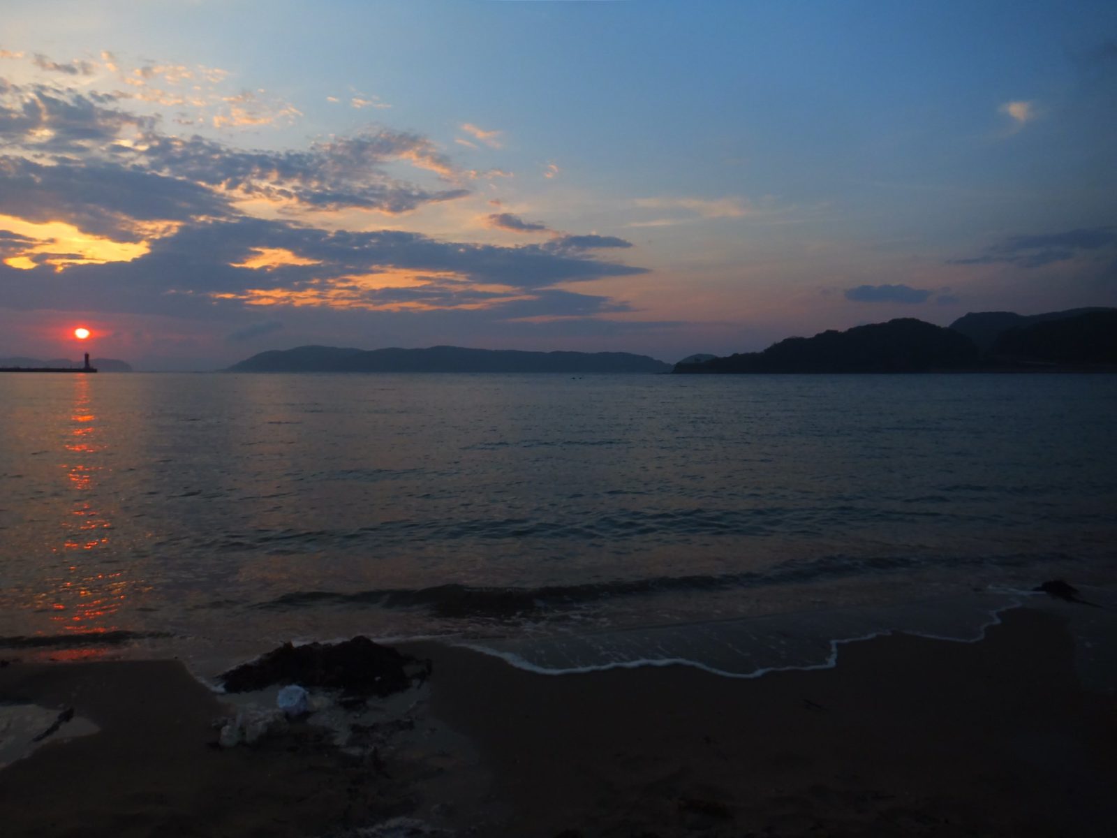 加太の海水浴場で見る夕陽。長旅もこれでおわりかと思うとなんだか切なくなります。明日は東京へ帰ります。