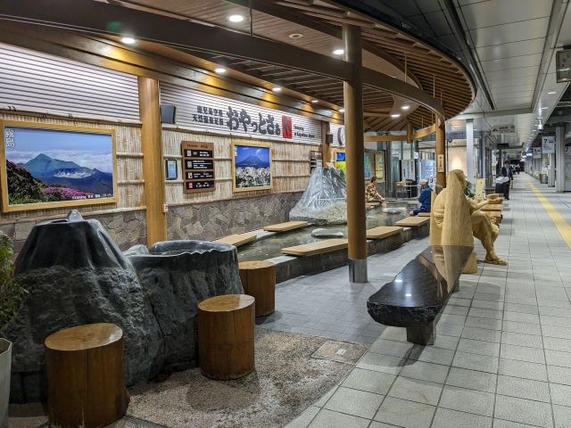 鹿児島空港の名物といえば、空港前のバス乗り場に設置された天然温泉足湯「おやっとさぁ」。無料に利用できる足湯は、旅の疲れをいやすのにぴったりのスポット。