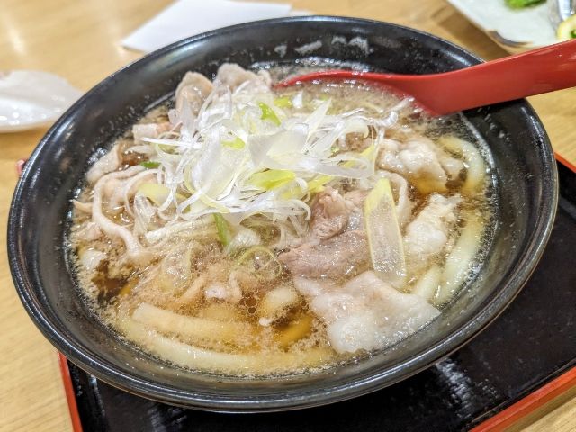 もちもちとした食感がたまらないうどん。ふわふわの黒豚がたっぷりのっており、豚の旨味が効いた甘口のだしが絶品。柚子胡椒もとっても合います。鹿児島のうどんってそこまで知られていない気がしますが、実はめっちゃ美味しいですよね。