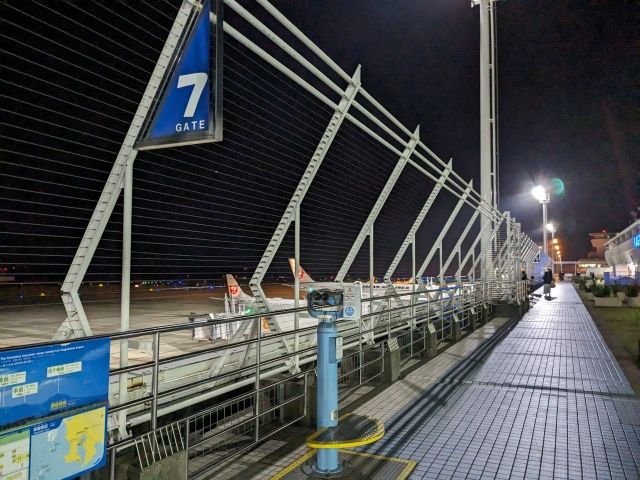 空港散策の定番といえば展望デッキ。すぐ近くの滑走路には出発準備を進める航空機が並びます。天気が良いと雄大な霧島連峰を見渡すことができるそうです。