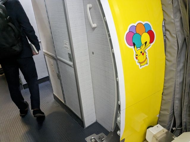 今回の機体はピカチュウジェット!全体を見たかったけど良い位置に窓が無かったので、ボーディング・ブリッジからちら見です。