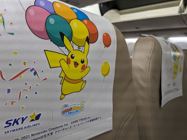 機内のヘッドレストカバーにもピカチュウ!機内放送にもポケモン要素が詰まっていたりと、とっても楽しい気分です。