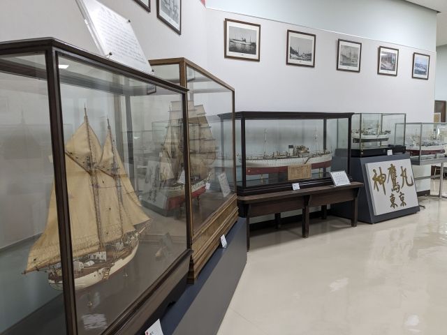こちらは歴代練習船の模型。初代練習船である帆船・快鷹丸(かいようまる)から、徐々に進化していく様子を立体で見ることができます。