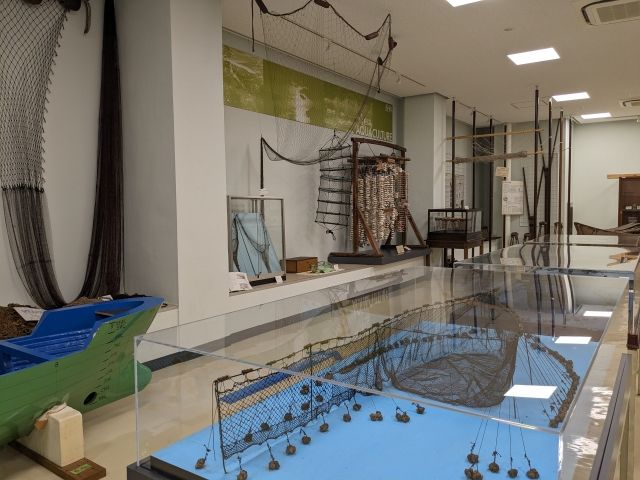 漁業に関する展示も扱っています。イセエビ漁の刺網やイワシ漁の巾着網、海苔の養殖に使用する道具など、実際に使用される道具の展示に加えて使い方の案内も。さらには缶詰の歴史や鰹節など、水産加工物に関する展示もあります。