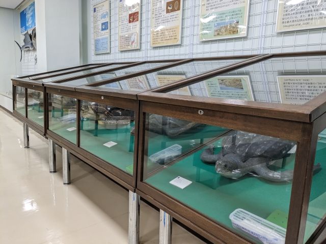 ずらりと並ぶウミガメ標本。メジャーなアカウミガメ、アオウミガメに加えて、オサガメやヒメウミガメも。見比べるとその違いは一目瞭然です。