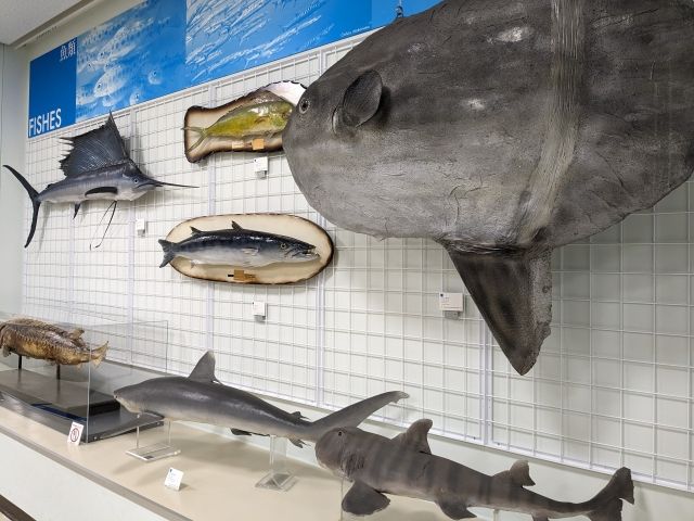 魚類の標本もたっぷり。マンボウ、オニカマス、バショウカジキ、カラチョウザメとインパクトある魚がずらりと並びます。