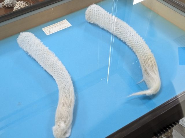 こちらのネットのようなものは、ヤマトカイロウドウケツという生物。内部には雌雄のドウケツエビがワンペアで入り込み、成長するとここから出ることなく一生を過ごすそう。「生きて偕(とも)に老い、同じ穴に葬られる」という意味の故事成語「偕老同穴」がその名の由来とのこと。