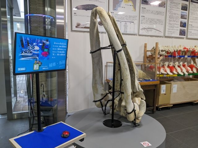 エントランスロビーに置かれているのは、コククジラの頭骨や肋骨、胸骨など。こちらは2016年3月4日に千葉県南房総市和田浦に漂着したもの。
