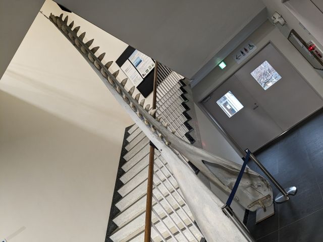 階段の傍にはマッコウクジラの下顎の骨。「ヒゲクジラ」であるコククジラとは異なり、こちらは「ハクジラ」と呼ばれるタイプであるため、びっしりと鋭い歯が並びます。ただし、エサとなるサカナやイカを捕食する際はほとんど噛まずに丸呑みしてしまうそう。この歯は、オス同士の繁殖争いに使用することが多いとのことです。
