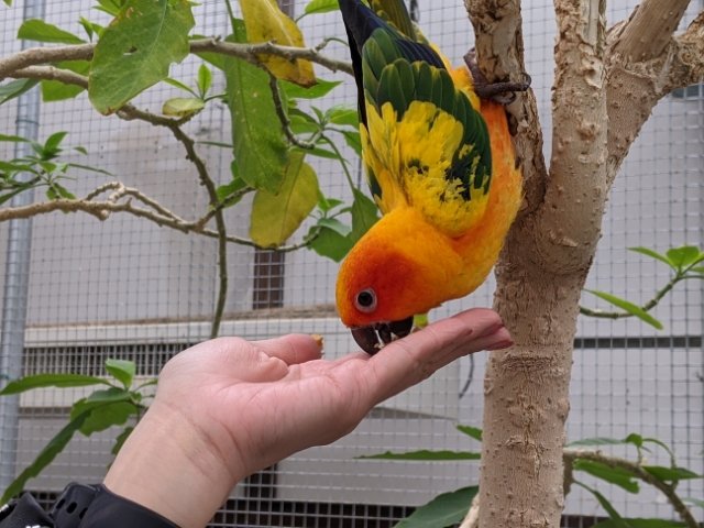 カラフルなコガネメキシコインコやワカケホンセイインコなどへエサやりも楽しめます。うっかり肩に乗ってくる、なんてこともあり、気軽にふれあいが楽しめるスポットです。