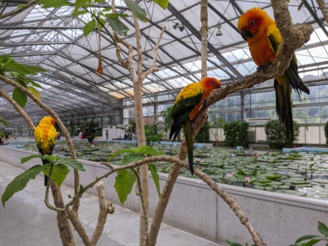 園内は温室のような屋内型となっており、様々な鳥が飼育されています。そのうち多くの種類が檻などのない放し飼い。広々とした空間でのびのびと暮らす鳥たちは、あちこちからバサバサッと飛び立ってきたり鳴き声をあげたりと元気いっぱい。