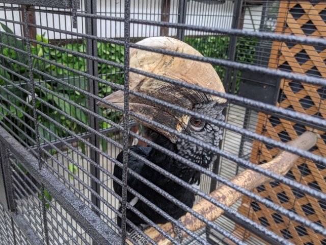 真っ黒い体に黄色の突起がインパクト抜群の鳥。まるで恐竜のような力強い顔つきをしています。人に育てられたため人馴れしていますが、男性には厳しく、女性には優しいらしいです。