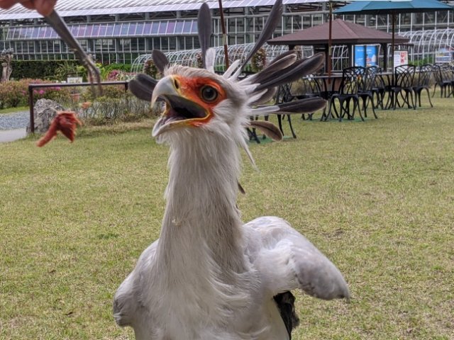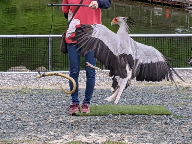 そして、必見なのがヘビクイワシ!この鳥のショーが見れるのは日本でおそらくココだけ。しかも10:30の回だけということで、がんばって早起きして訪問しました。