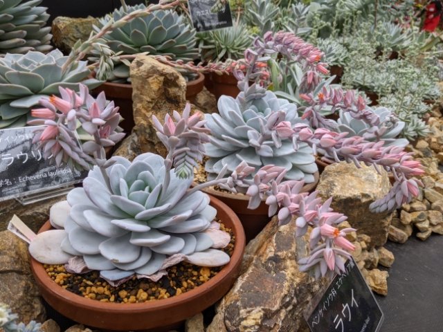 こちらは多肉植物のエケベリアたち。肉厚の独特の質感と、ぼんやりとしたカラーリングがとっても可愛らしい。