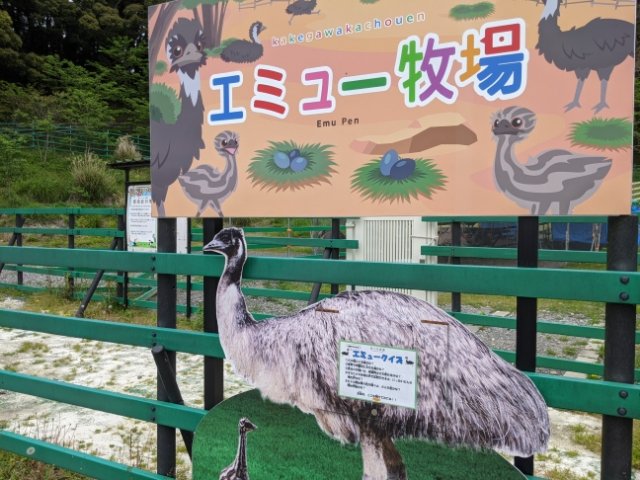 ダチョウについで世界で2番目に大きな鳥。時速50kmで走ることができます。園内にあるエミュー牧場は、放し飼いにされたエリアに入ってふれあいが楽しめる・・・・のですが、ただいまの期間は感染症対策のため、休止中でした。