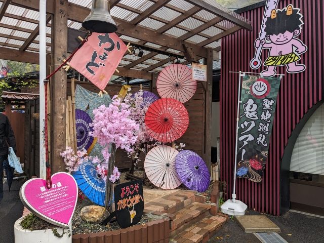 入口には和傘のフォトスポット。アミューズメント性の高さとインバウンド受け入れ体制の盤石さが伺えます。